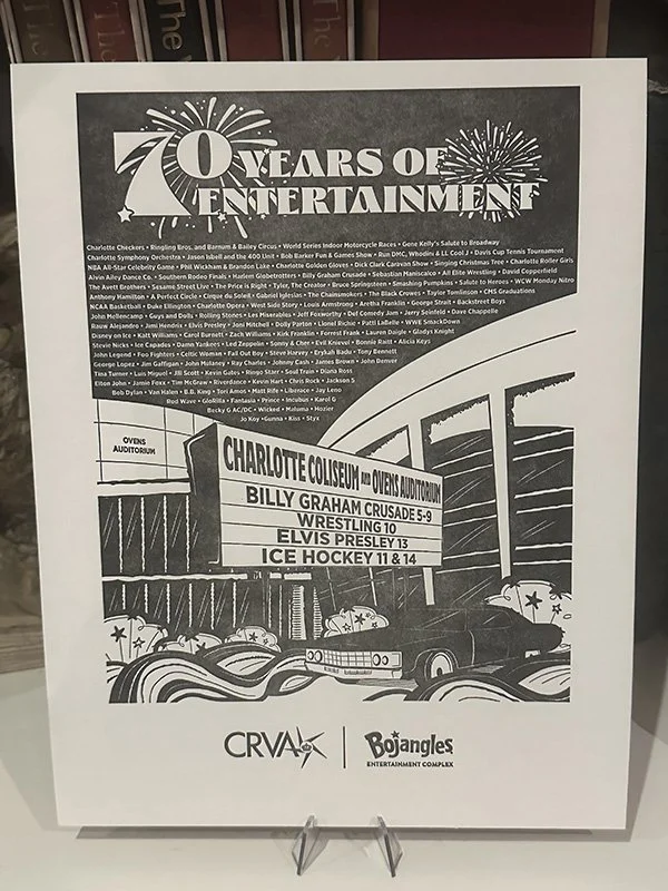 This design team from the Charlotte Regional Visitors Authority (CRVA) approached us about printing a letterpress poster for an event celebrating 70 years of entertainment at the Bojangles Entertainment Complex. The design is incredible and we were delighted to bring it to life with letterpress. It is printed on 100% cotton, heavyweight paper to show off the impression and provide a vintage feel.